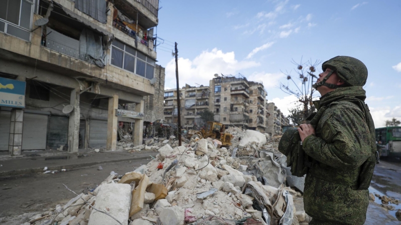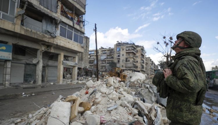 Российский солдат возле разрушенного в результате землетрясения жилого дома в Алеппо, Сирия