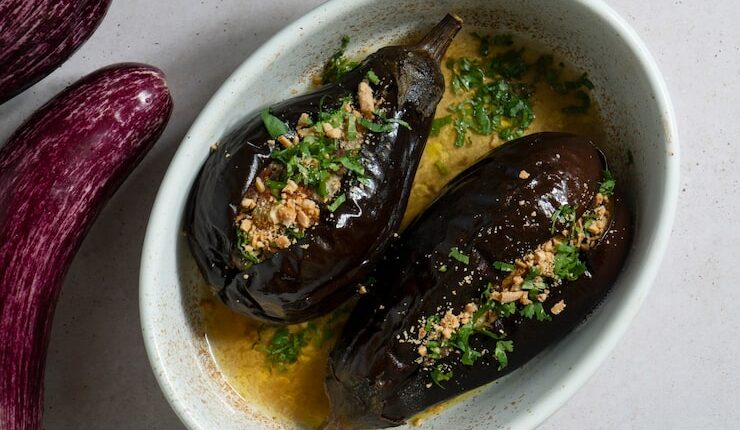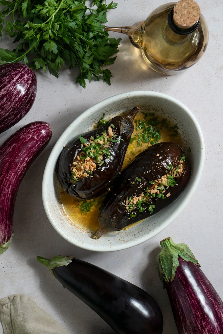 Перед приготовлением, обязательно вымойте и нарежьте пасленовые. Чтобы удалить горечь, можно сделать надрезы на кожице крест-накрест и замочить их в солевом растворе на 30 минут.