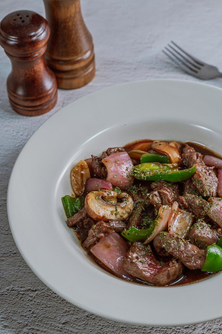 Начните с разделки мяса. Для этого возьмите говяжью вырезку и нарежьте ее тонкими ломтиками. Затем посолите и поперчите мясо по вкусу.