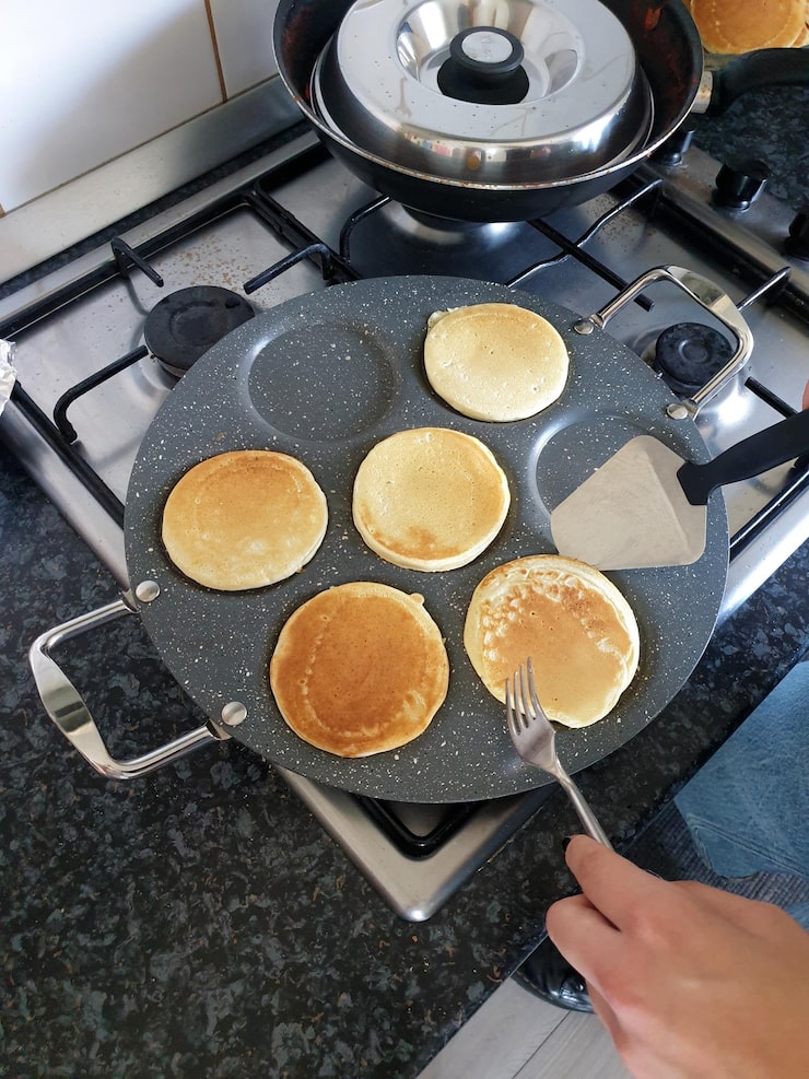 Разогрейте сковороду на среднем огне и добавьте немного масла. Используйте ложку, чтобы выложить тесто на сковороду, формируя небольшие оладьи. Жарьте их до тех пор, пока они не поднимутся и не образуют пузырьки на поверхности. Затем переверните оладьи и жарьте еще несколько минут, пока они не станут золотистыми.