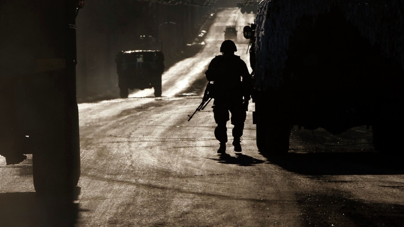 Солдат украинской армии у сломаного автомобиля на дороге недалеко от Артемовска. Архивное фото