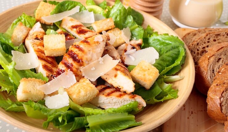 Теперь можно собрать салат. Начните с листьев салата ромэн. Разделите их на порции и добавьте кусочки курицы, сухарики и тертый пармезан. Заправьте лимонным соусом и подавайте немедленно.