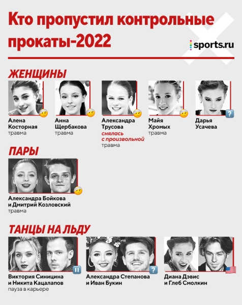 1. Алена Косторная и Анна Щербакова взяли самоотвод еще в августе – и перенесли операции (бедро и колено соответственно). Обе хотят вернуться, но понятно, что это не вопрос ближайших недель. Алену уж точно не стоит ждать на стартах в 2022-м; Анну – не исключено, но маловероятно.