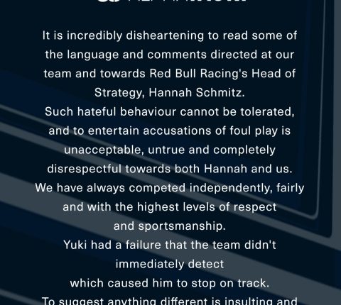 Мы всегда выступали честно, независимо и с высочайшим уровнем уважения и спортивного поведения. У Юки Цуноды случилась поломка, которую команда обнаружила не сразу – из-за этого он и остановился на трассе. Предполагать что-либо иное – это оскорбительно и категорически некорректно».