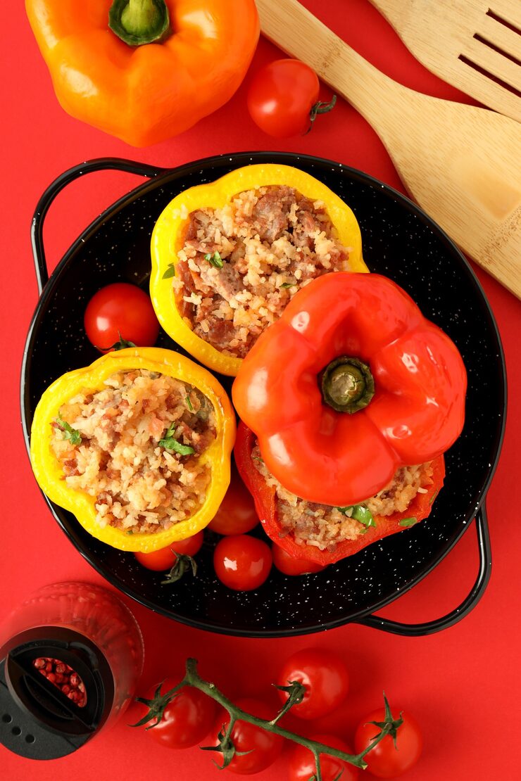 Теперь можно наполнить перцы фаршем. Убедитесь, что фарш плотно утрамбован, чтобы перцы сохранили свою форму во время приготовления. Если у вас остался лишний фарш, не выбрасывайте его — он отлично подойдет для приготовления соуса.