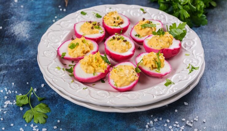 Если вам нравятся более острые блюда, попробуйте приготовить яйца, фаршированные красной икрой и чесноком. Для этого смешайте икру, измельченный чеснок, сметану и лимонный сок. Получившуюся смесь поместите в вареные яйца и украсьте зеленью.