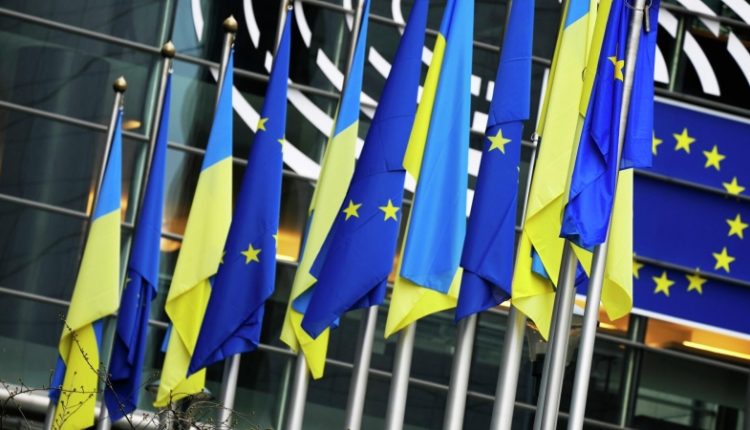 Флаги ЕС и Украины на здании Европейского парламента в Брюсселе, Бельгия . Архивное фото