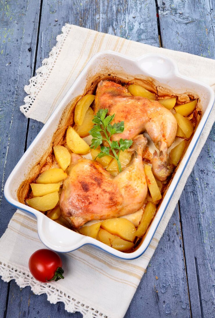 Перед тем, как поместить ингредиенты в духовку, их нужно правильно подготовить. Курицу и картофель нужно вымыть и обсушить. Затем картофель нарезают на крупные дольки, а курицу солят и перчат.