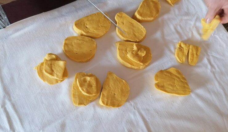 Теперь можно приступать к сборке пирожного. Раскатайте тесто и вырежьте из него круги диаметром около 6 см. Смажьте половину кругов кремом и накройте второй половиной. Аккуратно прижмите края и придайте пирожным форму «картошки». Поставьте их в холодильник на час, чтобы крем застыл.
