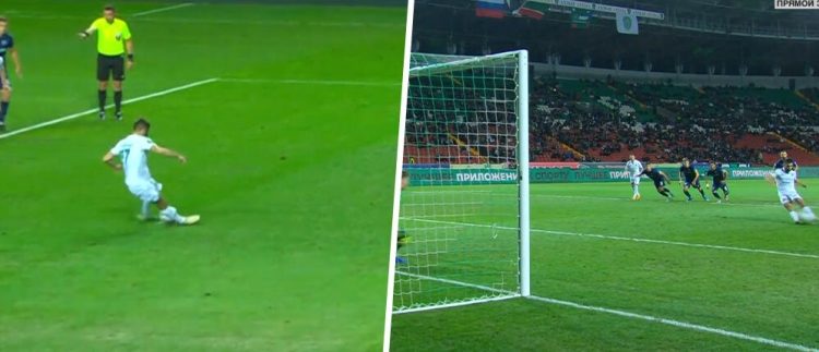 Форвард долго стоял и с мячом в руках, и при подготовке к разбегу, пока шла ВАР-проверка. Потом сделал несколько шагов – но поскользнулся, и мяч полетел по очень странной траектории верхом. Как будто паненка, только незапланированная.