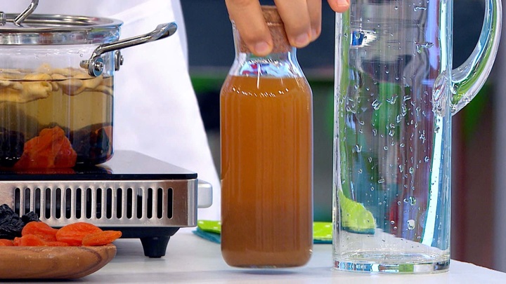Врач и ведущий программы о здоровье покупает в овощной лавке компотную смесь (сушеные яблоки и груши, курагу и чернослив), заливает полкило литром холодной воды в кастрюле, доводит до кипения и оставляет под крышкой на ночь. На утро богатый калием напиток готов. К слову, еще советский ученый М. И. Певзнер включил компот из сухофруктов в диету для кардиологических больных.