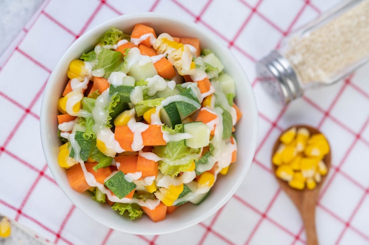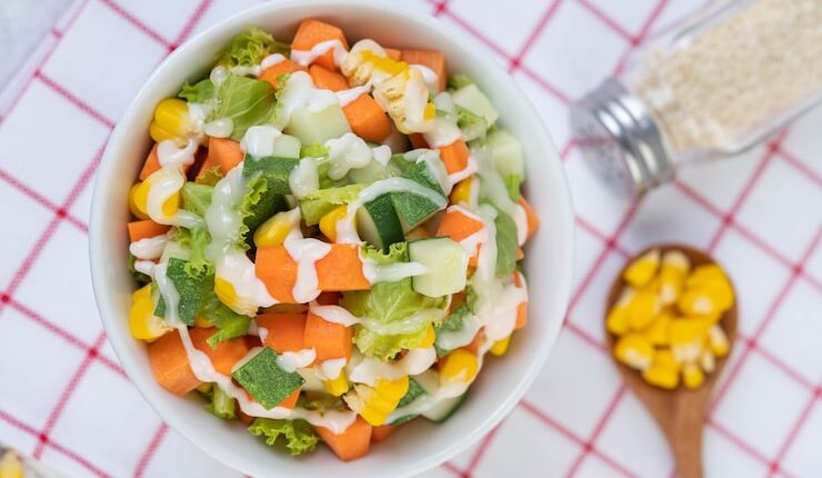 Для заправки салата можно использовать майонез, сметану или йогурт. Выбирайте натуральные продукты без добавления консервантов и ароматизаторов. Если хотите добавить остроты, добавьте в заправку немного горчицы или чеснока.