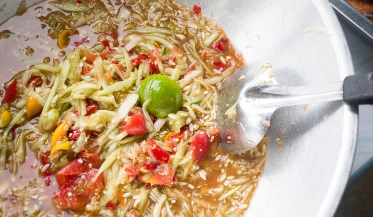 Теперь просто добавьте заправку в миску с салатом и хорошо перемешайте, чтобы все ингредиенты были равномерно покрыты. Если хотите, можете добавить в салат семена кунжута или подсолнечника для дополнительного хруста и питательных веществ.