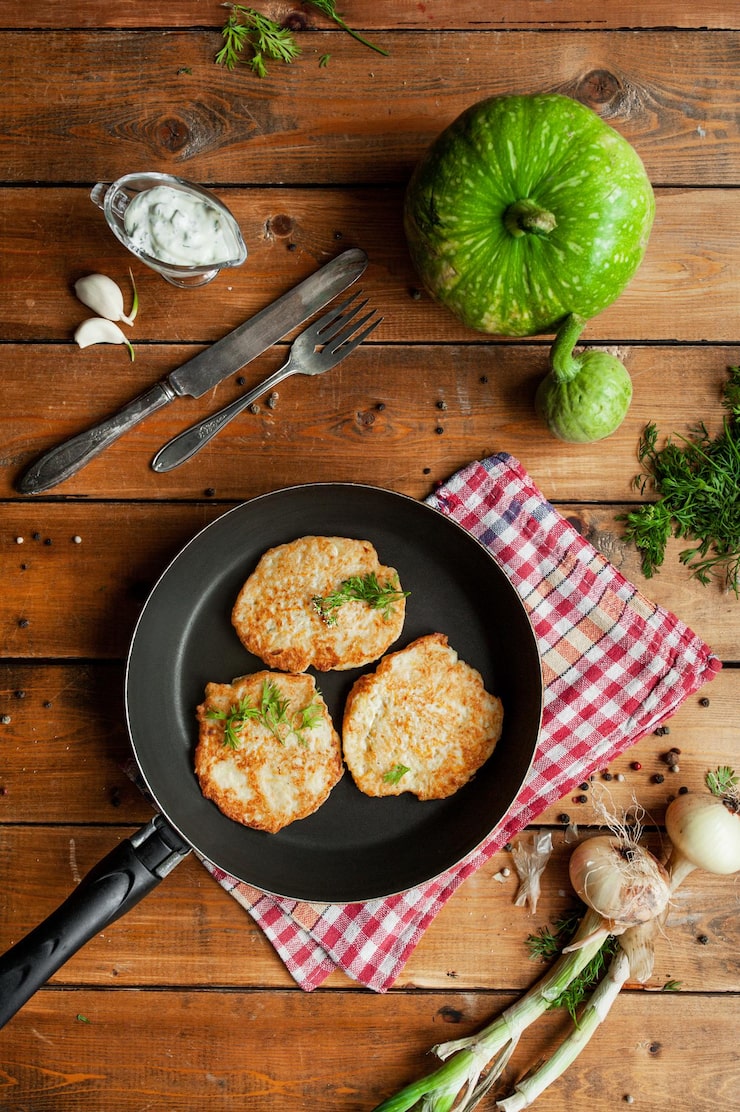 Разогрейте сковороду с небольшим количеством масла. Используйте ложку, чтобы сформировать оладьи и выложить их на сковороду. Жарьте оладьи на среднем огне до золотистой корочки с обеих сторон.