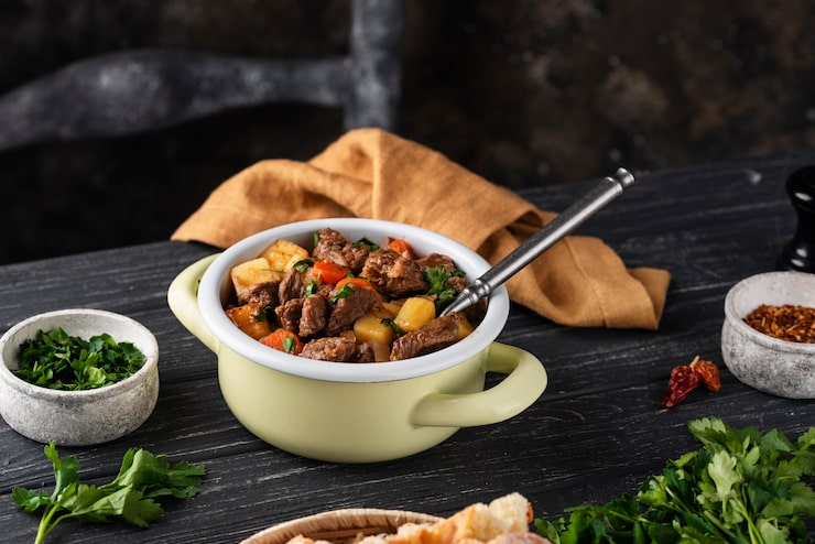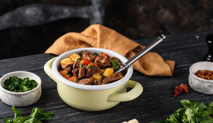 Начните с обжаривания кусочков говядины в кастрюле до румяной корочки. Затем добавьте лук и чеснок, обжаривайте до мягкости. Добавьте картофель, морковь и лук-порей, тушите до полуготовности. Влейте бульон, доведите до кипения, затем убавьте огонь и тушите под крышкой, пока картофель не станет мягким. Разомните картофель вилкой или блендером до состояния пюре. Добавьте специи, соль и перец по вкусу. Подавайте горячим, украсив зеленью.