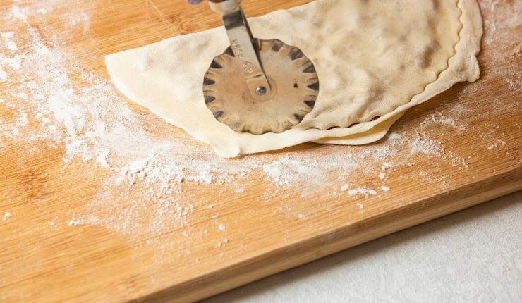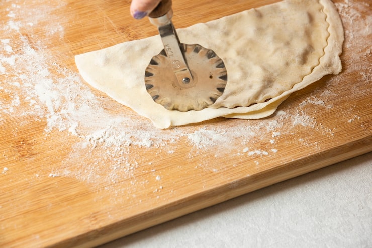 Теперь вы можете приступить к приготовлению вареников. Раскатайте тесто на припыленной мукой поверхности до толщины около 3 мм. Используйте стакан или кольцо для выпечки, чтобы вырезать кружочки теста диаметром около 6-7 см.