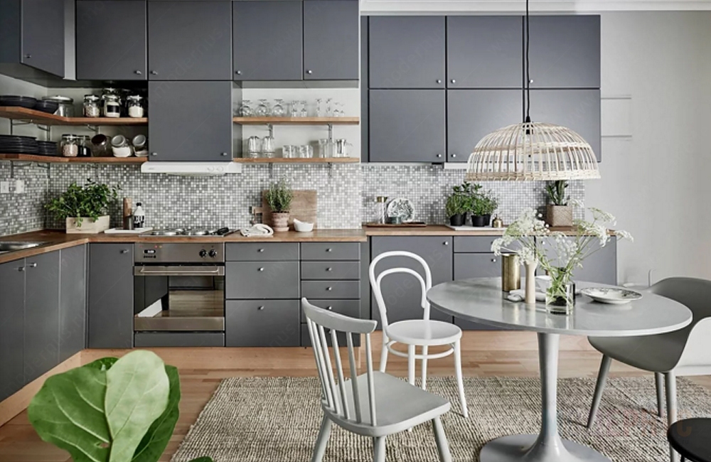 - Вы планируете проводить на кухне минимальное количество времени, то весьма целесообразно сделать упор именно на это, отдав предпочтение лишь символическому набору шкафчиков, столешниц и бытовой техники.