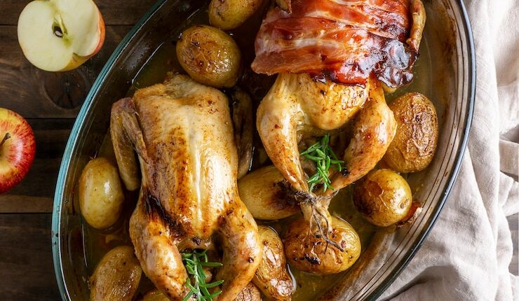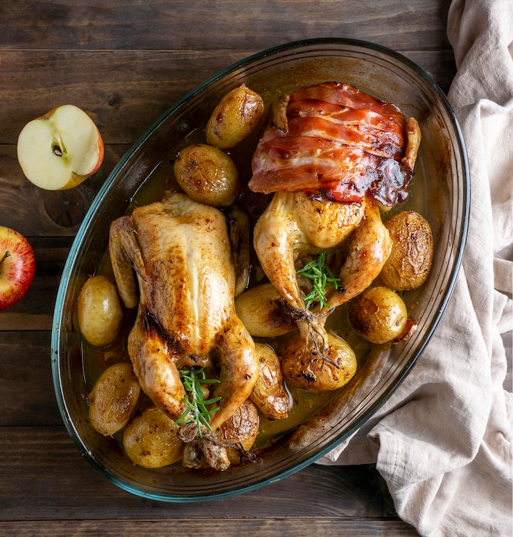 Запекайте курицу и картофель в духовке в течение 45-60 минут, в зависимости от размера курицы и картофеля. Чтобы проверить готовность, воспользуйтесь термометром для мяса и убедитесь, что внутренняя температура курицы достигла 75°C.