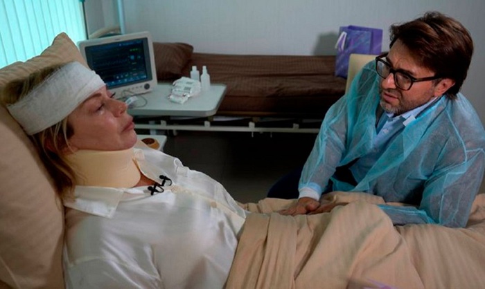 Сначала артистка, которой врачи вроде как прописали полный мимический покой, прямо в больничной палате пообщалась с Андреем Малаховым. Хотя выглядела при этом действительно страдающей: на шее — корсет, голова перебинтована.