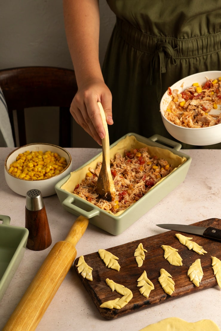Затем переложите смесь в подготовленную форму для выпечки. Если вы используете сыр, натрите его на терке и посыпьте им поверх пасты. Это добавит аромат и хрустящую корочку.