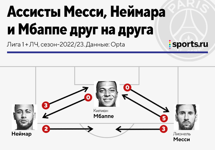 Еще одно яркое доказательство: Мбаппе просто не делает ассистов на партнеров по атаке. Месси и Неймар организовали для Килиана 8 голов во всех турнирах (и еще 5 друг для друга), но в обратную сторону механизм не работает.