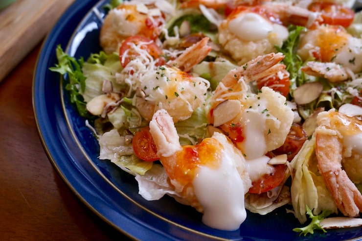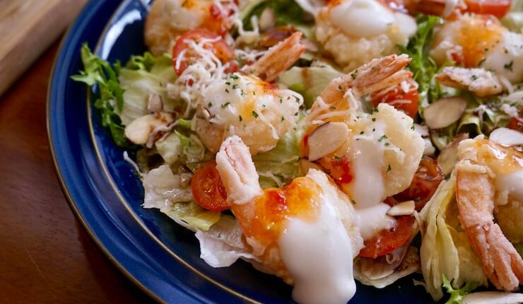 Теперь можно собрать все ингредиенты воедино. На тарелку выкладываем листья салата, сверху кладем жареные морепродукты, а затем поливаем все соусом. Для еще большей пикантности можно добавить немного свежей зелени, например, петрушки или укропа.