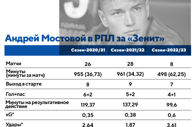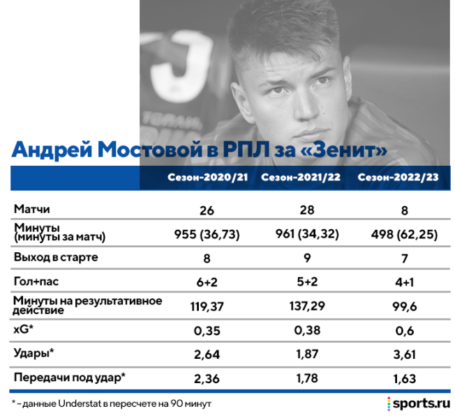 Главная причина игры в основе в прошлом – травмы конкурентов. В дебютном сезоне-2020/21 Мостовой затыкал дыры, когда Сергей Семак переходил на линейные 4-4-2 (а когда все были здоровы, использовался ромб, где сложно найти место для Мостового). В РПЛ-2021/22 стало чуть проще благодаря новой схеме – команда активно выставляла 3-4-3, но «Зенит» купил Клаудиньо, который быстро забрал левый край. И все-таки повреждения партнеров позволили Мостовому регулярно играть осенью.