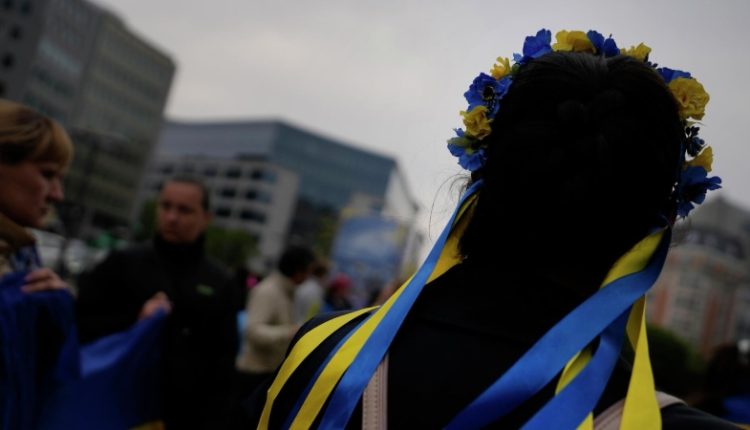 Девушка с ободке с лентами в цвет флага Украины. Архивное фото
