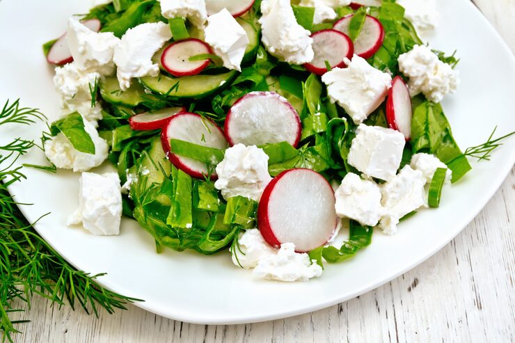 В большой миске соедините все подготовленные овощи. Заправьте их соусом из сметаны и тщательно перемешайте. Подавайте салат сразу же, пока он хрустящий и свежий.