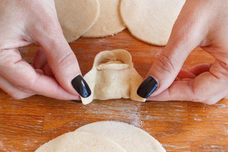 После того, как тесто отдохнуло, раскатайте его тонко и разрежьте на небольшие кружочки. Каждый кружок положите на ладонь, сделайте из него чашечку и положите внутрь шарик начинки. Защипните края теста, чтобы получился мант. Повторите процедуру с остальными кружочками.