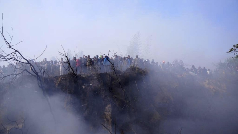 Местные жители на месте крушения пассажирского самолета в Покхаре, Непал