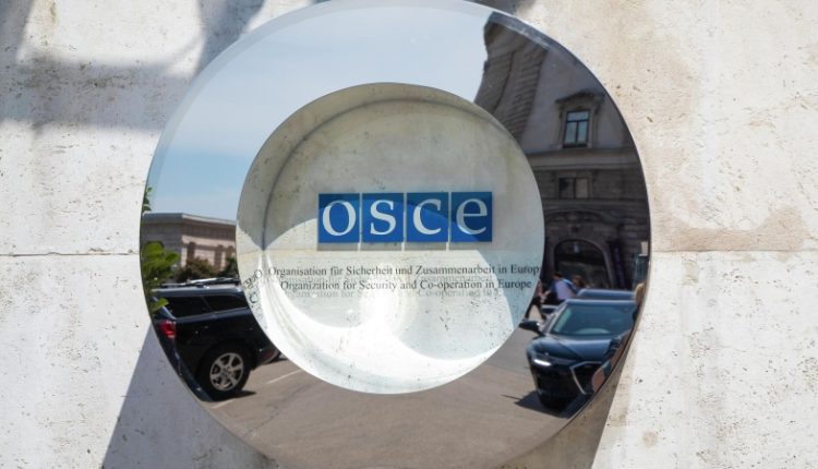 Логотип ОБСЕ на здании в Вене, где проходит заседание постоянного совета Организации по безопасности и сотрудничеству в Европе. Архивное фото