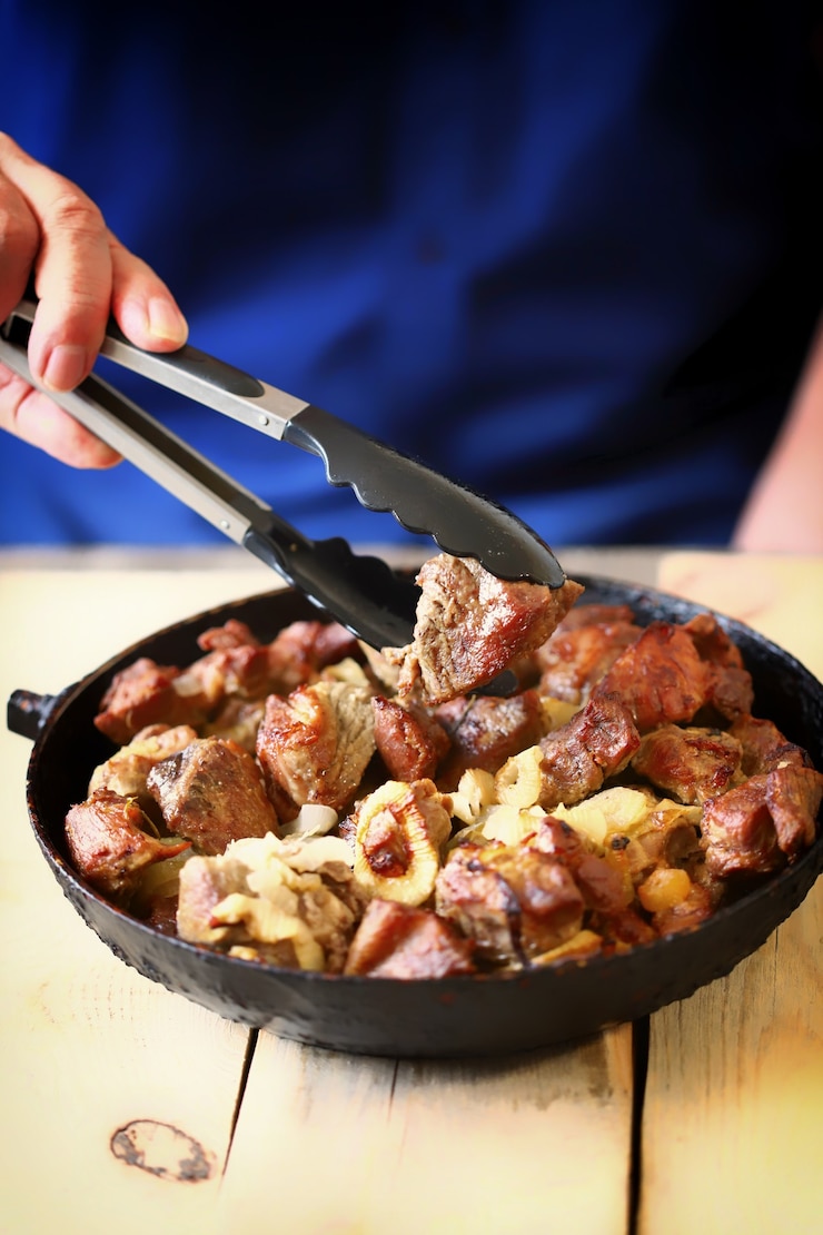 Мясо лучше всего нарезать на куски средней величины, чтобы оно равномерно прожарилось. Лук и чеснок можно мелко порубить или пропустить через пресс, в зависимости от того, какой консистенции вы хотите добиться в блюде.