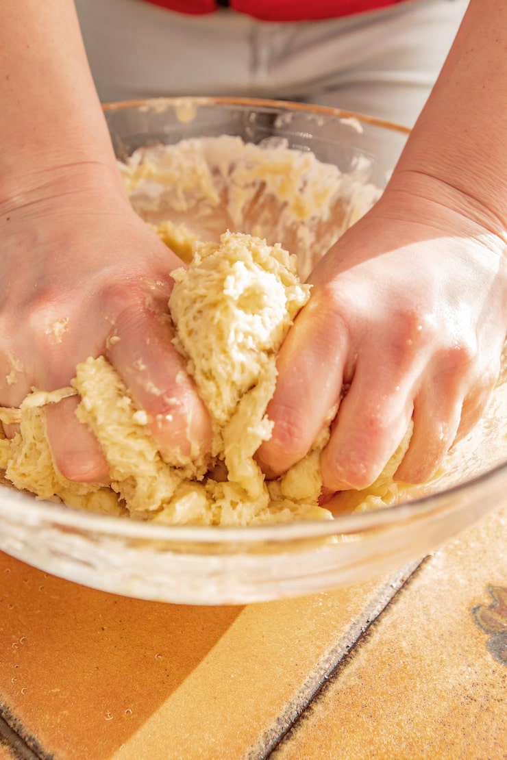 Если тесто получается слишком густым, добавьте немного воды. Если слишком жидким, добавьте немного муки. Цель состоит в том, чтобы получить тесто консистенции густой сметаны.