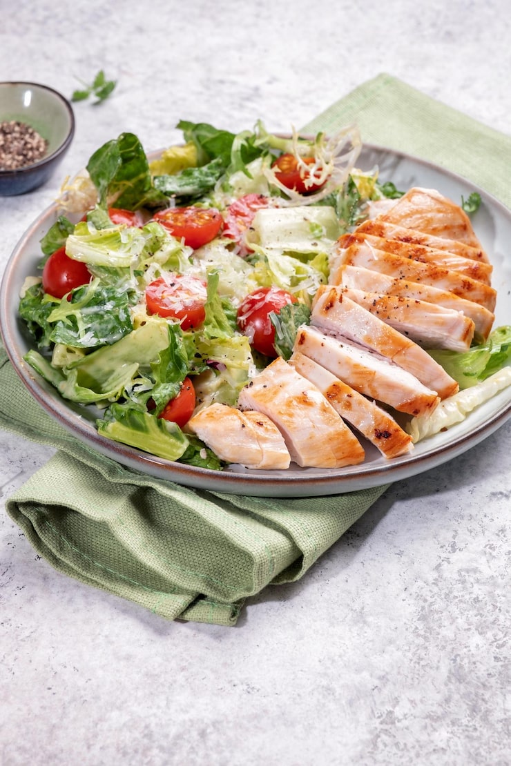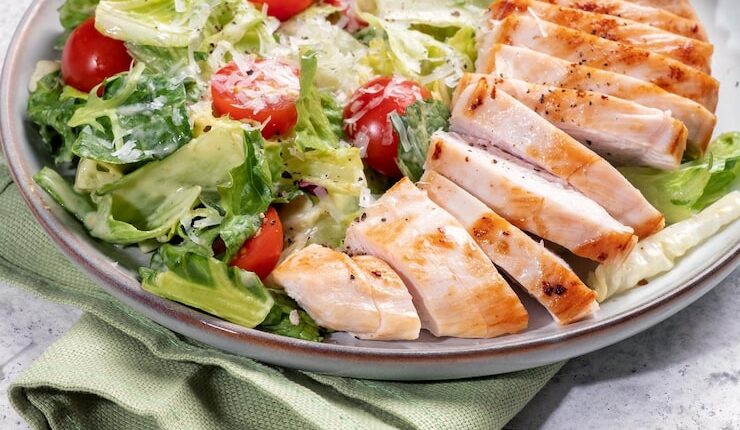 Основным ингредиентом этого салата является куриная грудка, богатая белком и низкокалорийная. Чтобы приготовить ее, просто обжарьте курицу на сковороде с небольшим количеством оливкового масла до готовности. Затем нарежьте ее на небольшие кусочки и добавьте в салат.