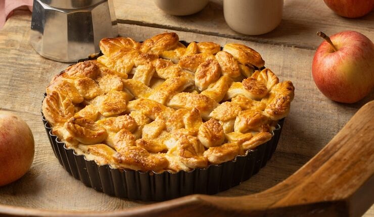 Выпекайте пирог при температуре 190 градусов в течение 40-45 минут или до тех пор, пока верхняя корочка не станет золотистой, а яблоки не начнут пузыриться по краям. Дайте пирогу остыть перед подачей на стол.