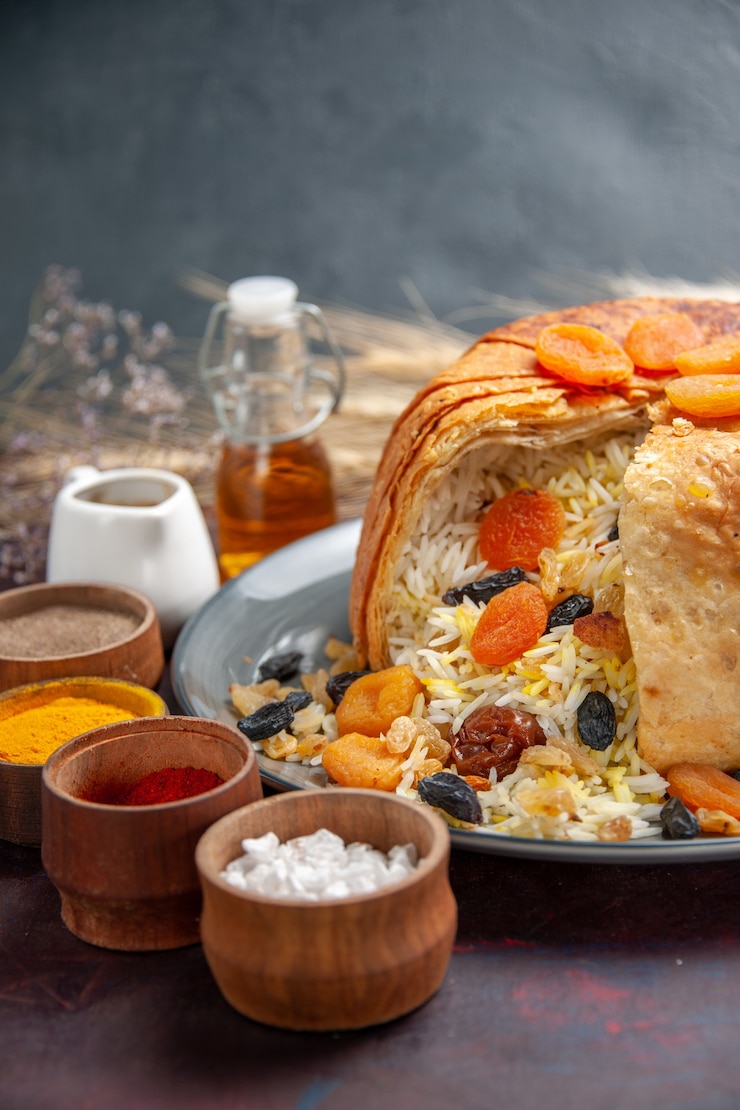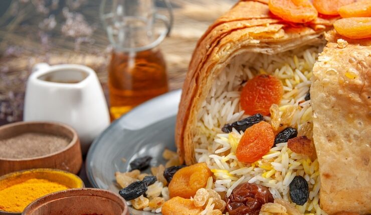 В конце приготовления добавьте изюм и орехи, перемешайте и дайте плову настояться под крышкой еще несколько минут.