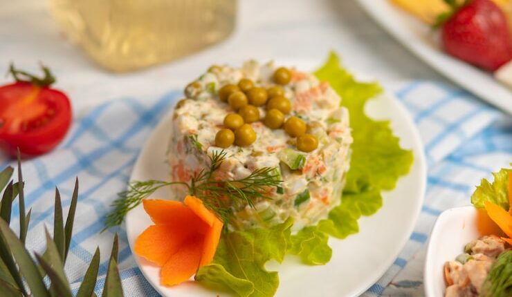 Последним шагом будет добавление заправки к салату. Аккуратно перемешайте все ингредиенты, чтобы они равномерно покрылись заправкой. Если салат кажется слишком сухим, добавьте немного больше майонеза или лимонного сока.