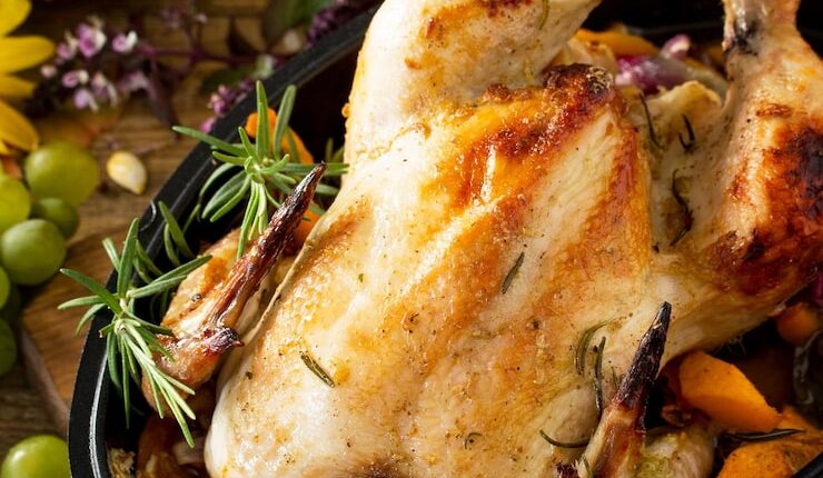 Поставьте форму в духовку и запекайте курицу в течение 1 часа 15 минут. Чтобы проверить готовность, проткните курицу вилкой и убедитесь, что сок, который вытекает, прозрачный, а не розовый.