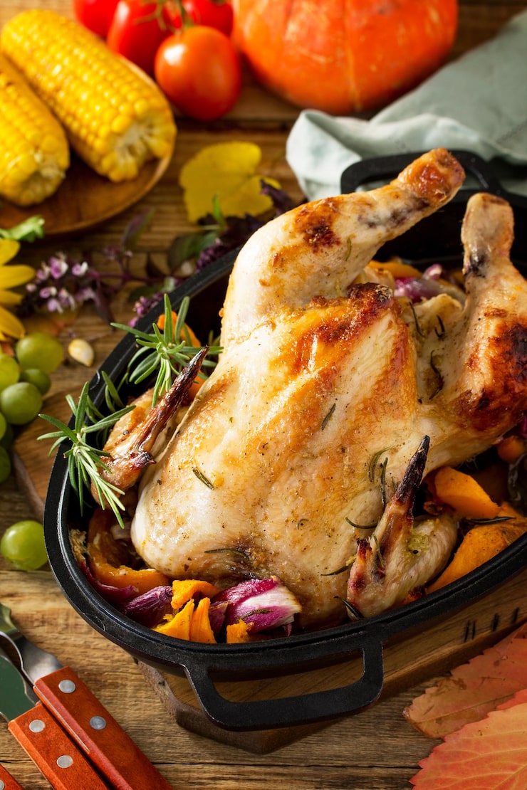 Поместите курицу в форму для запекания, положив ее на спинку. Если хотите, можно добавить в форму для запекания дольки лимона и чеснока для дополнительного аромата.