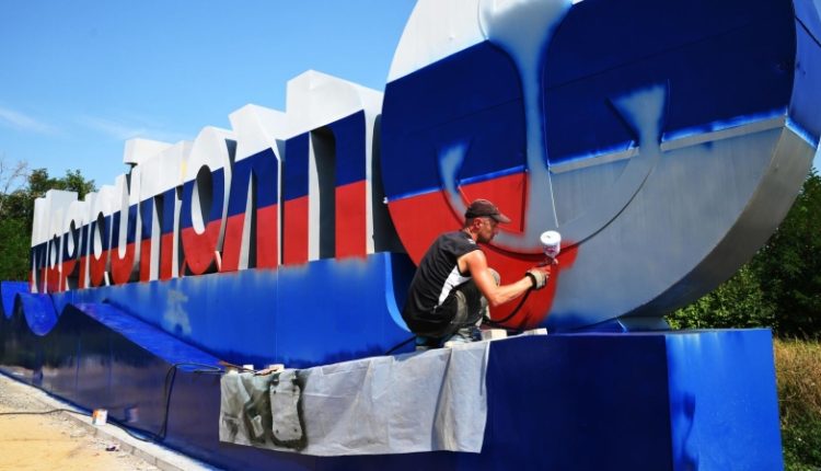 Рабочий красит в цвета российского флага стелу на въезде в Мариуполь. Архивное фото