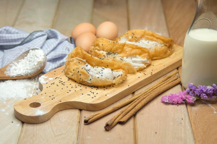 Начните с приготовления теста. Смешайте 2 стакана рисовой муки с 1/2 чайной ложки соли и 1/2 чайной ложки сухих дрожжей. Добавьте 1/2 стакана теплого молока и 1 яйцо. Замесите тесто и дайте ему подняться в течение часа.