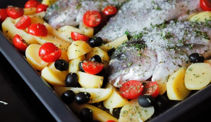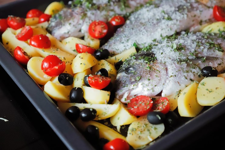Теперь перейдем к рыбе. Для этого рецепта можно использовать любую рыбу, но мы рекомендуем выбрать что-то с нежной текстурой, такое как тилапия или окунь. Нарежьте рыбу на порционные куски и выложите их на тот же противень с картофелем. Сверху рыбу можно приправить лимонным соком, чесноком и свежими травами, такими как петрушка или укроп.