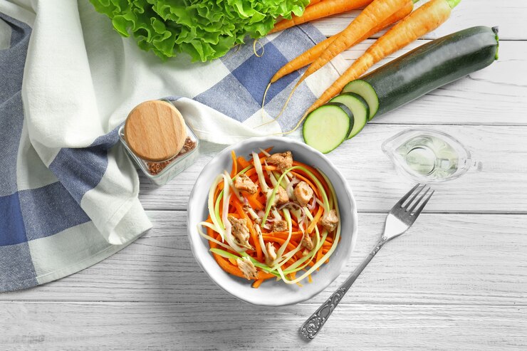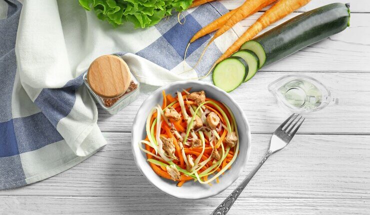 Если вы ищете простой и быстрый способ приготовить вкусный и здоровый обед, то этот корейский салат с овощами и фунчозой — идеальный выбор. Фунчоза — это китайская лапша, которая готовится всего за несколько минут и отлично сочетается с овощами. В этом рецепте мы используем морковь, огурцы, болгарский перец и зеленый лук, но вы можете добавить любые другие овощи по вашему вкусу.