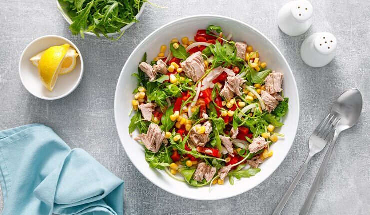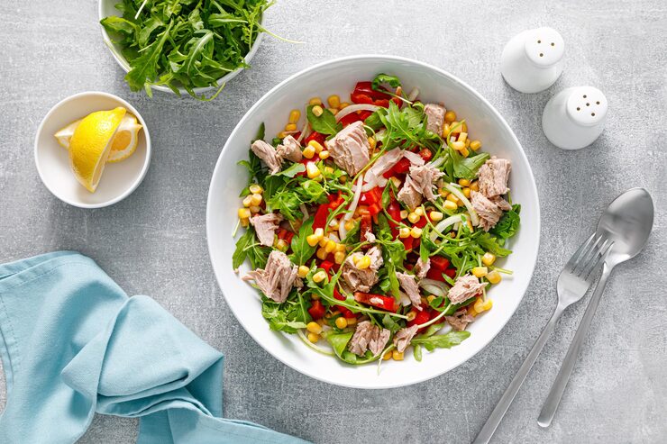 Начните с главного ингредиента — рыбы. Мы предлагаем использовать консервированный тунец, который уже приготовлен и богат белком. Он идеально сочетается с хрустящими огурцами и сладкой кукурузой, создавая идеальный баланс вкусов.