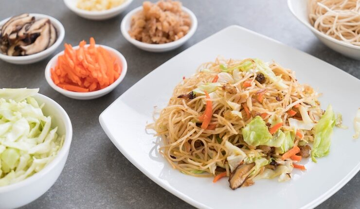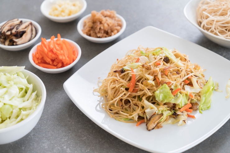 Начните с приготовления лапши согласно инструкциям на пакете. Пока лапша варится, нарежьте овощи и мясо. Затем обжарьте овощи и мясо на сковороде до готовности. Добавьте лапшу и соевый соус, и ваше блюдо готово!