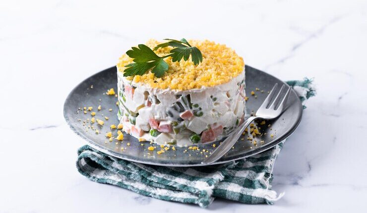 Приготовление салата с курицей, кукурузой, сыром и яйцом