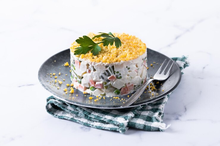 Начните с приготовления ингредиентов. Отварите яйца и остудите их, затем нарежьте кубиками. Также нарежьте кубиками копченую птицу и сыр. Если вы используете замороженную кукурузу, разморозьте ее перед добавлением в салат.