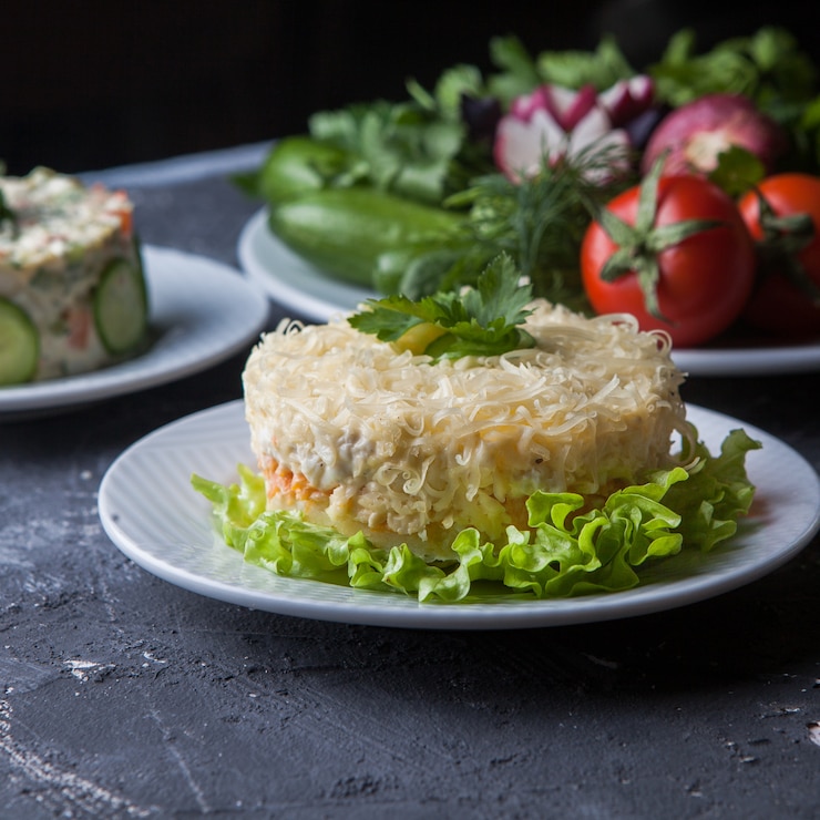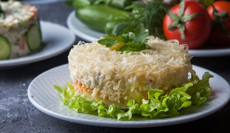 Последним слоем должен быть сыр. Это добавит дополнительный вкус и текстуру салату. Если вы хотите добавить еще один слой вкуса, можно полить салат соусом или заправкой перед подачей на стол.