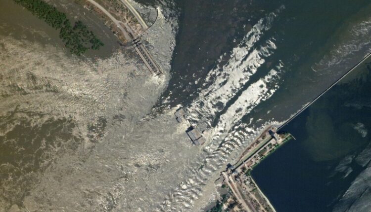 Разрушения Каховской ГЭС. Фото со спутника. Архивное фото